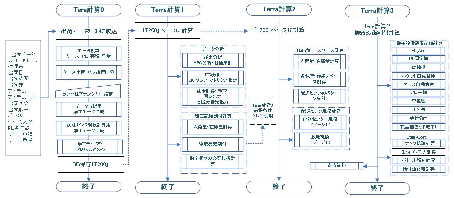| Tera Calculation uses the EIQ method to process and analyze large volumes of shipping data, exceeding 100,000 records. It is extremely fast because it processes data against a database using SQL language. The method and steps are as follows: 1. Import shipping data in Elxce format into the database. 2. Pre-process shipping data to reduce analysis time. Classify shipments into case and bulk shipments, convert bulk quantities to cases, PL, volume, and weight, rank based on rank keys, etc. 3. Estimate inventory and incoming shipment volumes and create an EIQ matrix table using EIQ analysis. 4. Allocate logistics equipment to the EIQ matrix table to calculate logistics space. 4. Calculate distribution center size by tallying and adjusting the installation space for each piece of logistics equipment. For more information, please visit TCalc: |
